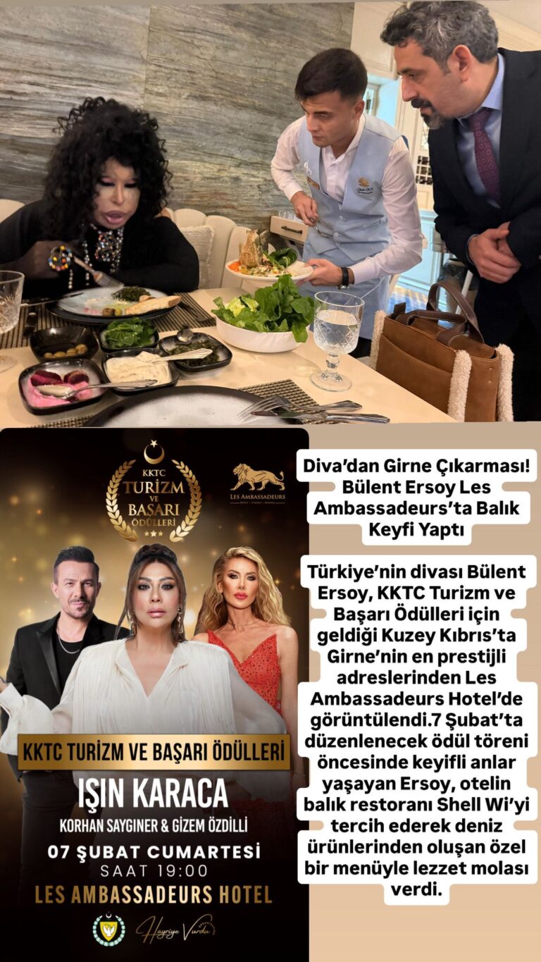 Türkiye’nin divası Bülent Ersoy, KKTC Turizm ve Başarı Ödülleri için geldiği Kuzey Kıbrıs’ta Girne’nin en prestijli adreslerinden Les Ambassadeurs Hotel’de görüntülendi.7 Şubat’ta düzenlenecek ödül töreni öncesinde keyifli anlar yaşayan Ersoy, otelin balık restoranı Shell Wi’yi tercih ederek deniz ürünlerinden oluşan özel bir menüyle lezzet molası verdi.Girne’nin seçkin gastronomi durakları arasında yer alan Shell Wi, sunduğu taze balık ve deniz mahsulleriyle öne çıkarken, Bülent Ersoy’un bu tercihi mekânın elit konuk profiline bir kez daha dikkat çekti.Sanat dünyasının güçlü ismini ağırlayan Les Ambassadeurs Hotel, ödül töreni için adaya gelen ünlü konukların da buluşma noktası olmaya devam ediyor. Diva’nın Girne ziyareti, ödül gecesi öncesinde magazin gündemine renk kattı.